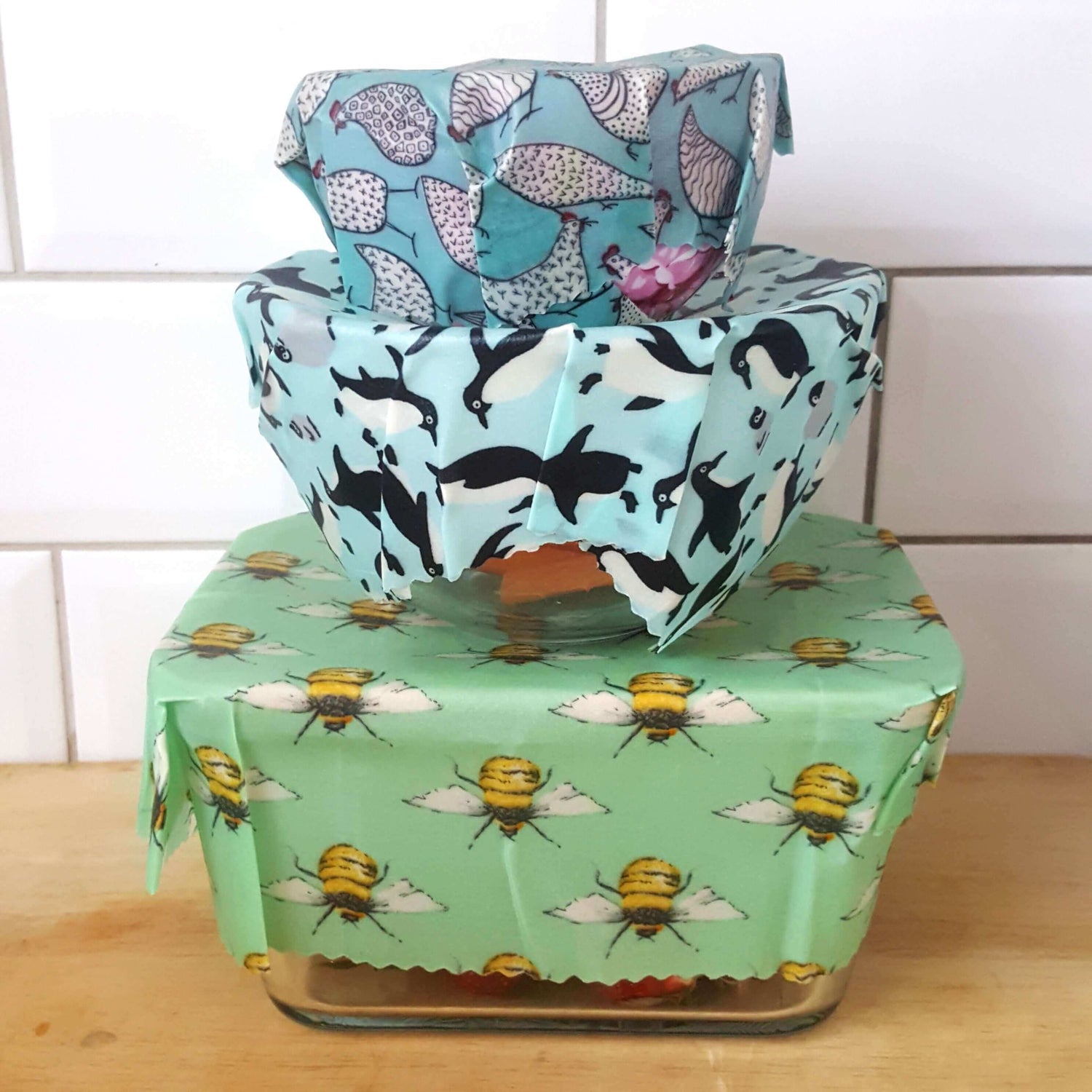 1 Large, 1 Medium, 1 Small beeswax food wrap in the patterns pictured